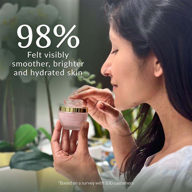 - How should I apply GheesutrÄ Face Emulsion for best results?After cleansing, apply a generous amount of the emulsion to your face and neck, gently massaging until fully absorbed. For enhanced benefits, use it after applying the Daily Repair or Ageless Serum.