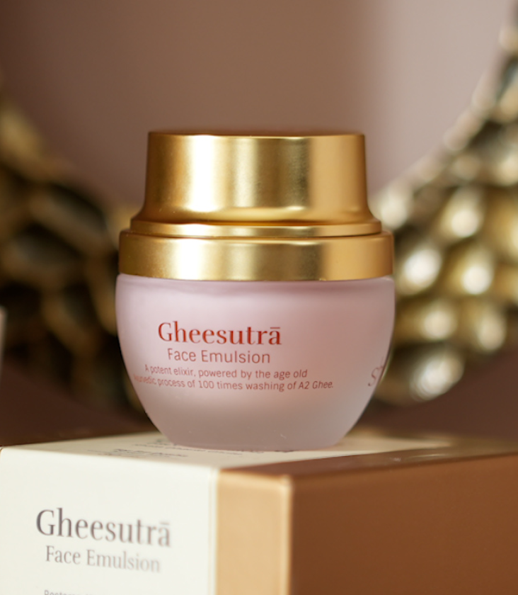 The GheesutrÄ Face Emulsion is distinguished by its unique 100-times washing of Ghee process, which creates a highly purified and nourishing base. Combined with potent actives like Vitamin C and ancient herbs, this emulsion provides unparalleled hydration and revitalization, making it a luxurious choice for skincare.