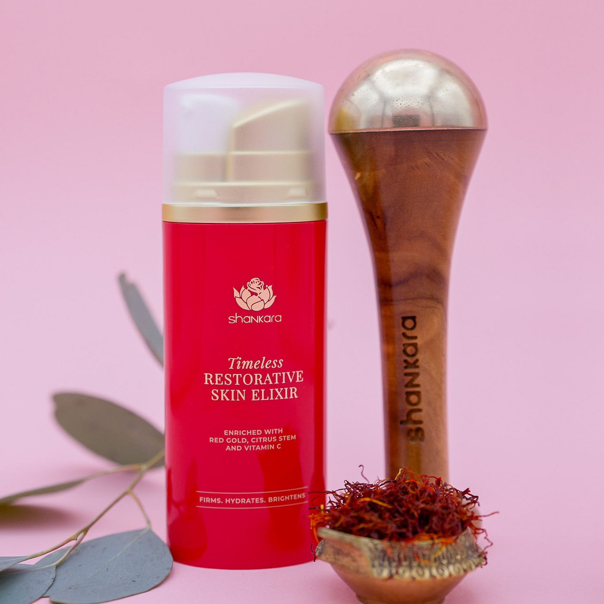 - What makes the Timeless Restorative Skin Elixir unique?The Timeless Restorative Skin Elixir combines the power of handmade Kumkumadi Oil and a hydrating citrus stem serum with high levels of vitamin C in a convenient dual-chamber bottle, offering a 100% active age-control solution.
