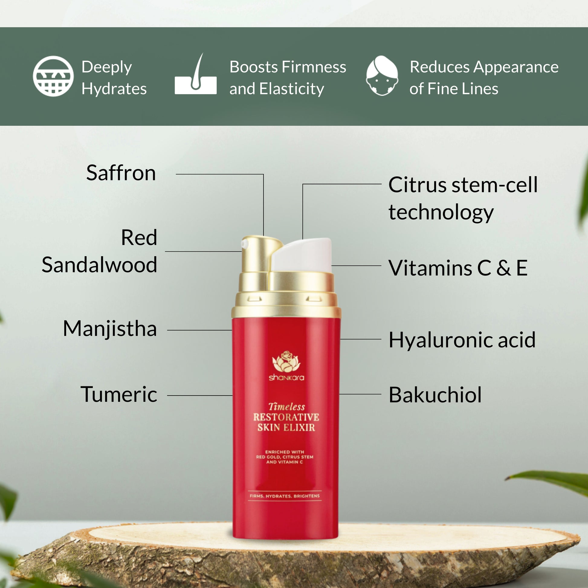 The Timeless Restorative Skin Elixir is an award-winning, age-defying dual concentrate that combines the time-honored Kumkumadi Oil with cutting-edge citrus stem cell technology. Packed with 32 super herbs, hyaluronic acid, and vitamins C and E, this elixir reduces the appearance of wrinkles, brightens skin, and provides intense hydration for a youthful appearance in just 7 days.